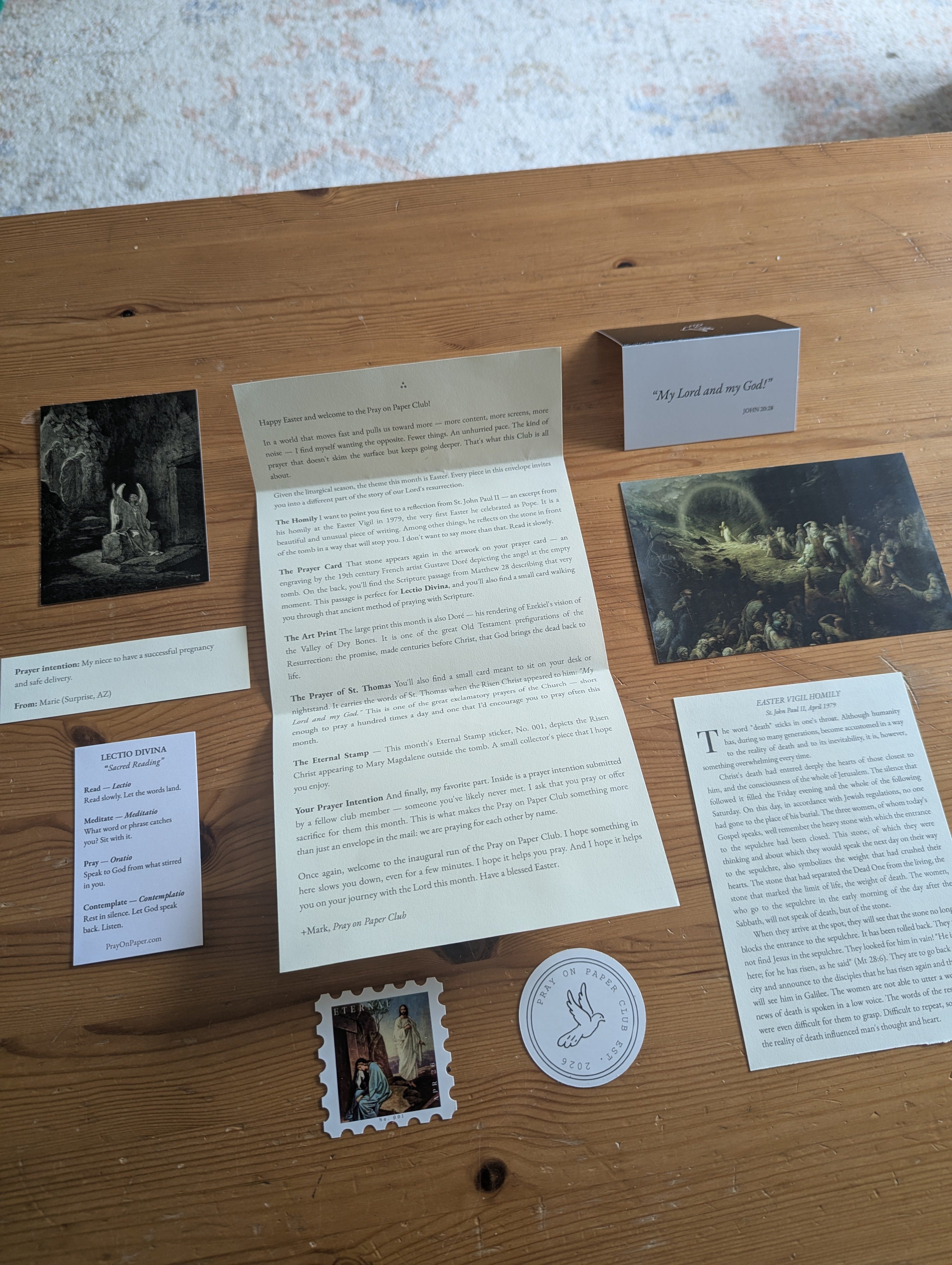 A prayer card featuring an engraving by the 19th century French artist Gustave Doré — the angel at the empty tomb. On the back, the Scripturepassage from Matthew 28 describing that exact moment. Perfect for Lectio Divina. A small card walking you through that ancient method of prayer was included too.
